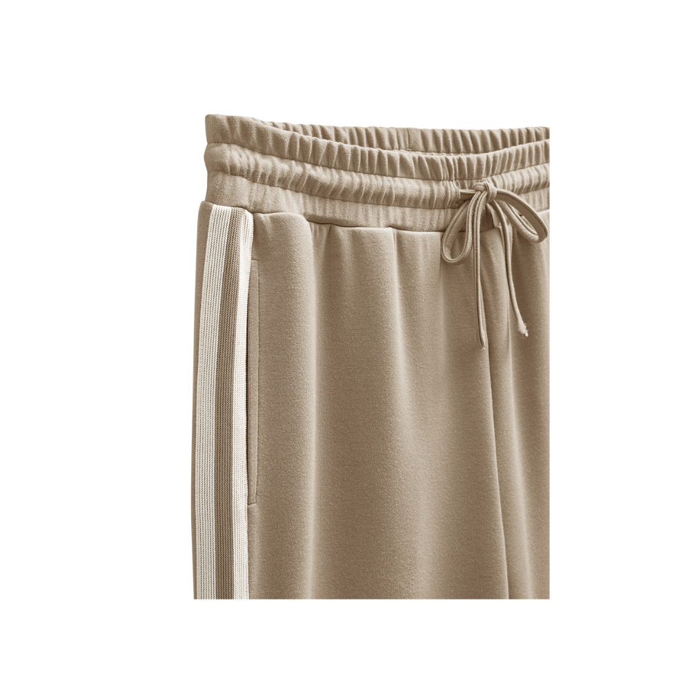 Pants from Freequent in a soft material. The pants have a simple silhouette with an elasticated waistband and a drawstring, side pockets, straight, wide legs and side tape details.