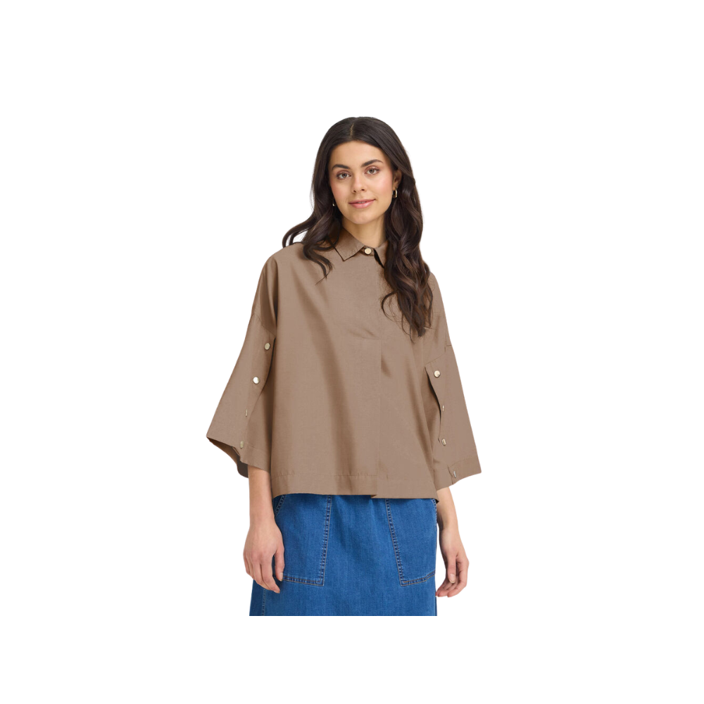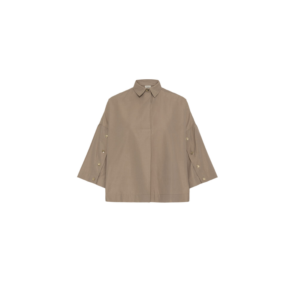 Denne moderne skjorte kombinerer et minimalistisk design med iøjnefaldende detaljer. De vide ærmer med dekorative knapper tilfører et stilfuldt og feminint twist, som giver skjorten et unikt udtryk.
