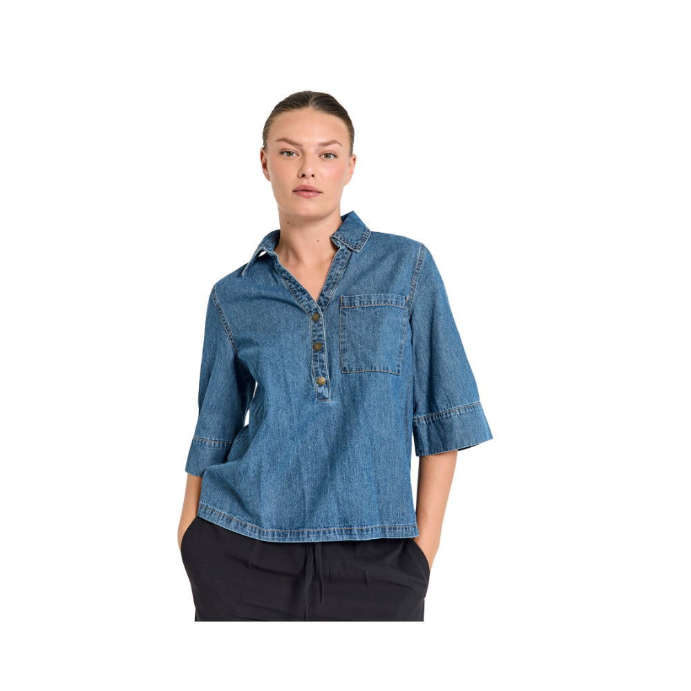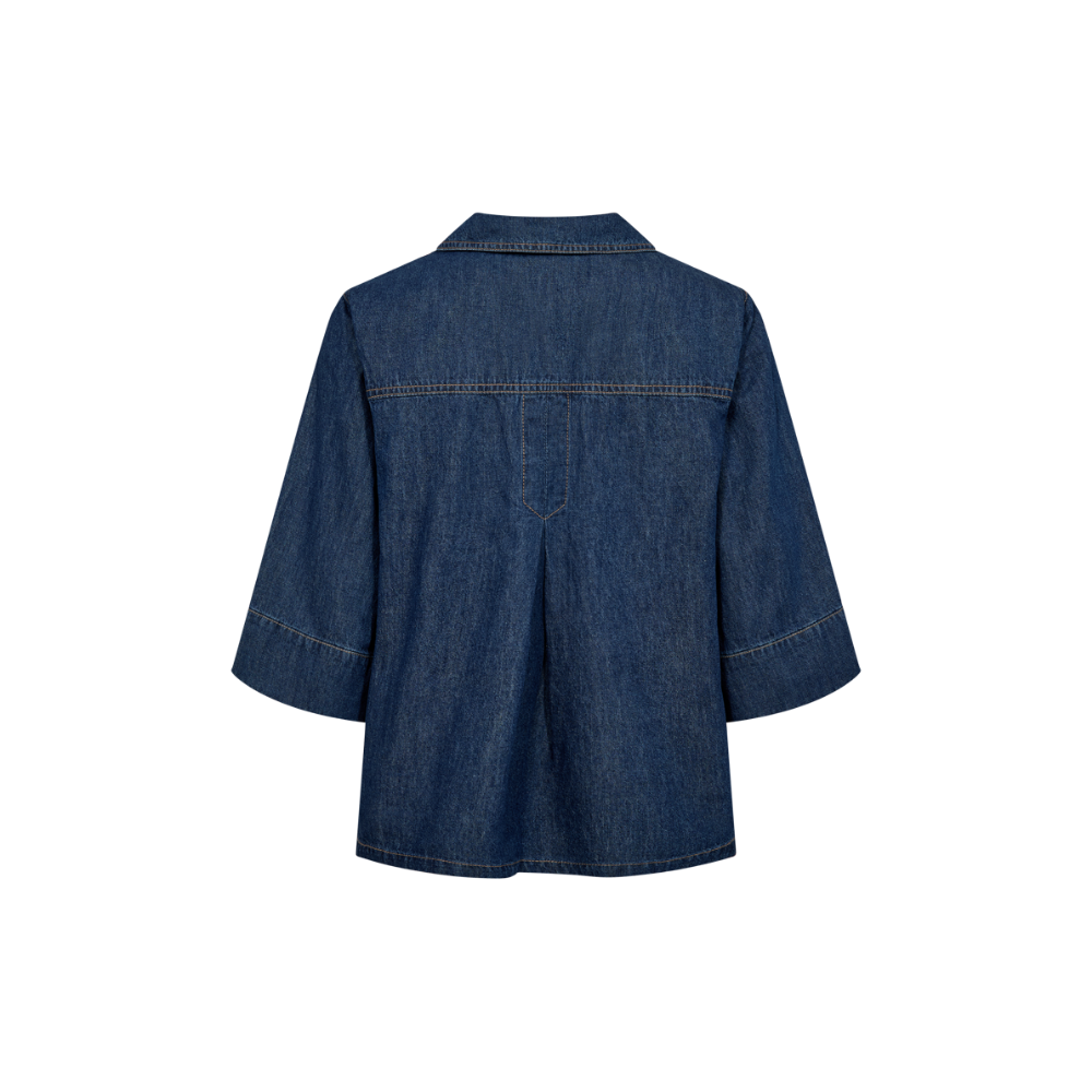 Blouse from Freequent in a soft denim material. The blouse has press studs with logo detail on the front, V-neck with collar edge, half sleeves with width, a single chest pocket as well as a box pleat on the back highlighting the loose fit.