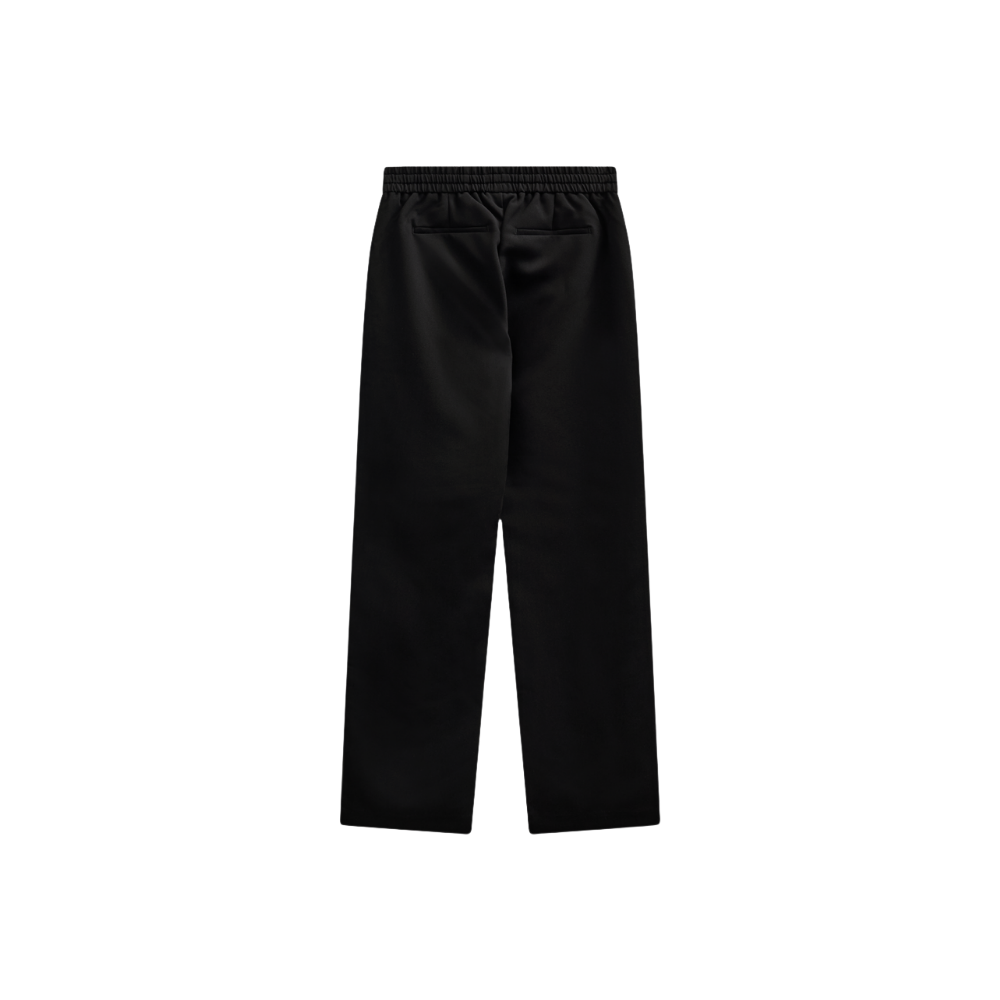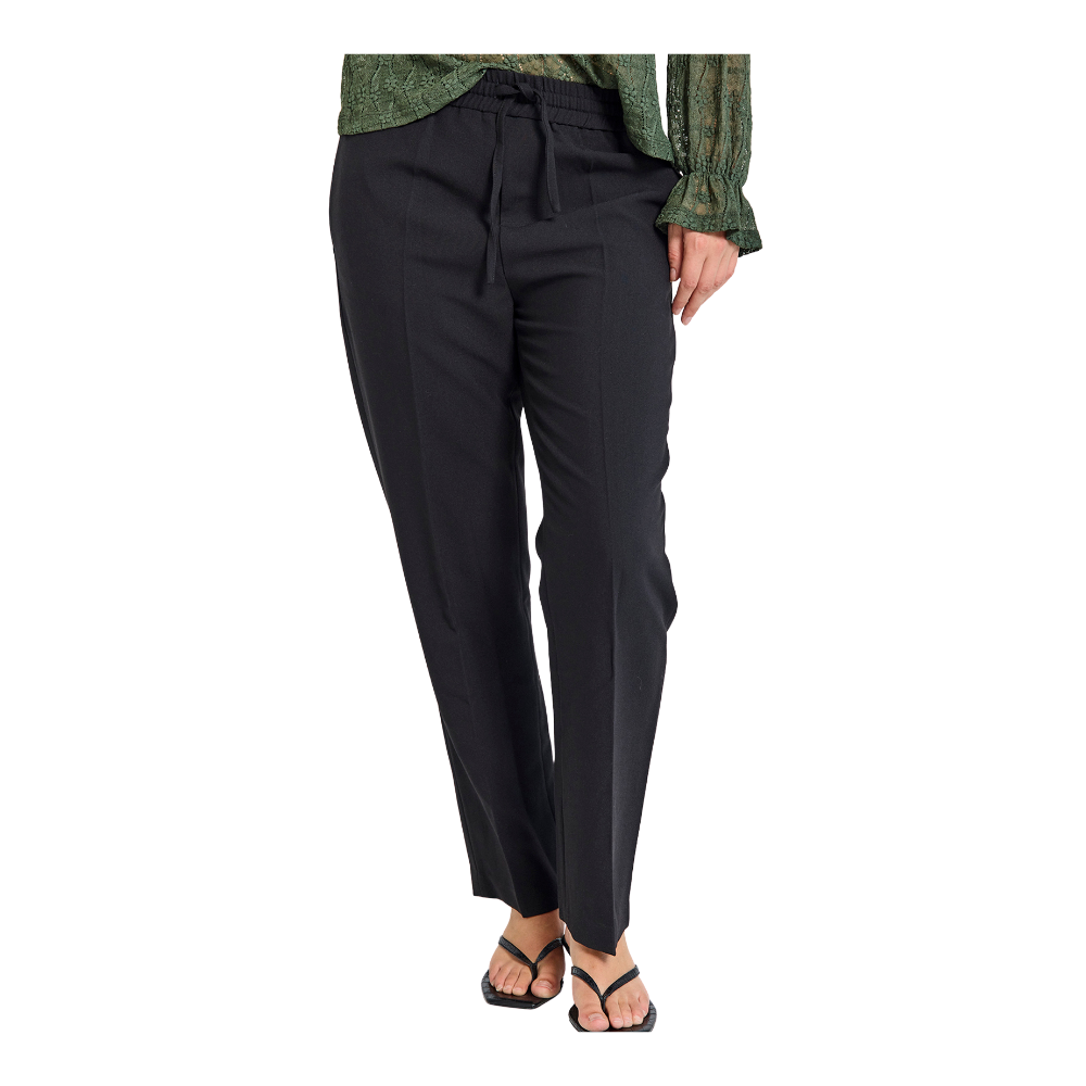 Pants from Freequent in a soft material. The pants have a simple silhouette with a straight fit, an elasticated waistband with tie-strings, creases, and front and back pockets.