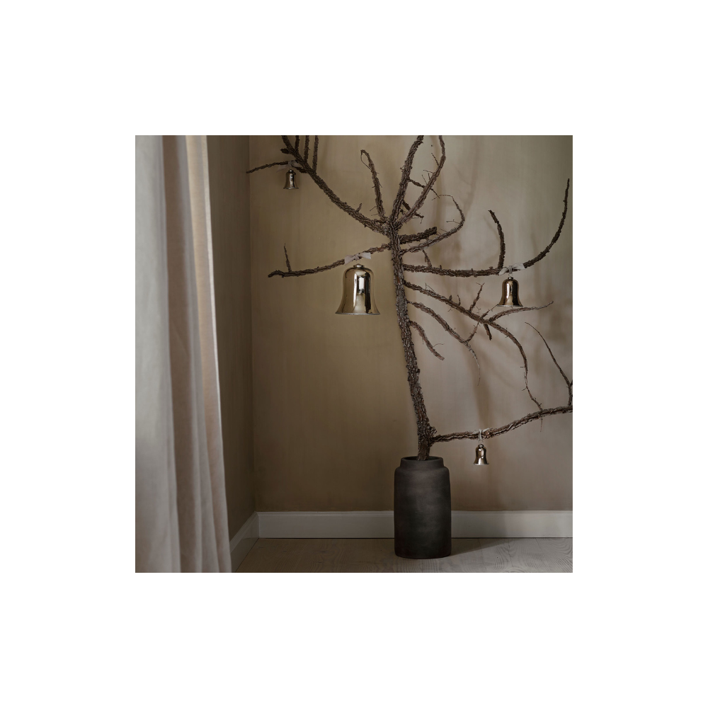 Dekorativ juleklokke i glas med glimmer. Klokken har en varm karamelfarve og kan hænges på grene, i vinduet eller på juletræet som en del af årets pynt.