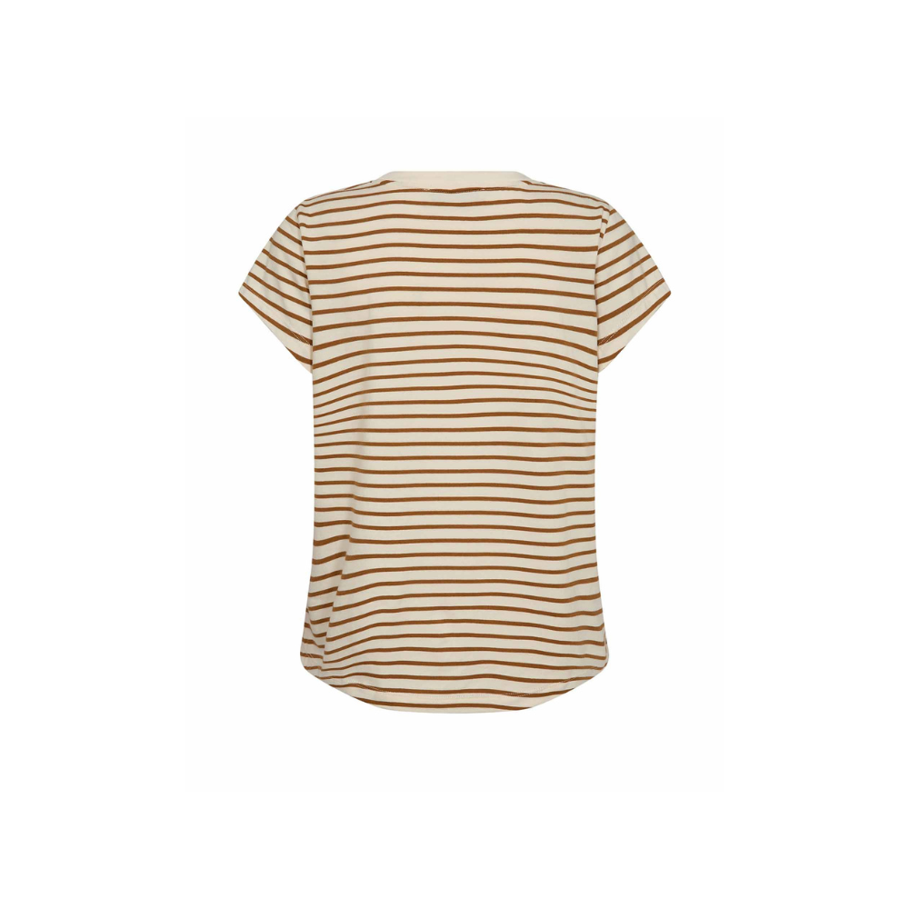 En tidløs, stribet T-shirt med et feminint touch. Den er designet i en figursyet pasform med V-udskæring og korte ærmer og fremstillet i blød, strækbar bomuld for komfort hele dagen. Perfekt alene eller under en blazer – med jeans eller skræddersyede bukser for et klassisk, ubesværet look.