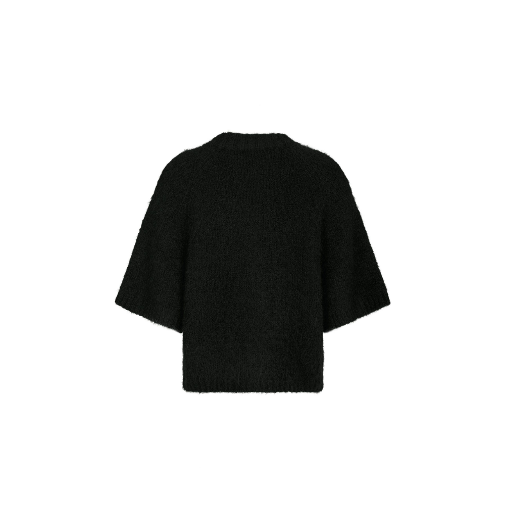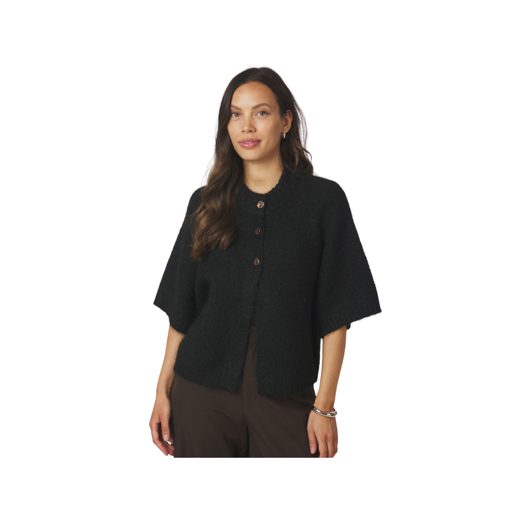 Boxy strik cardigan med vidde på ærmerne og smukke knapper foran. Kvaliteten er lækker blød og har et fluffy udtryk. Modellen er 176 cm og er iført størrelse 36.