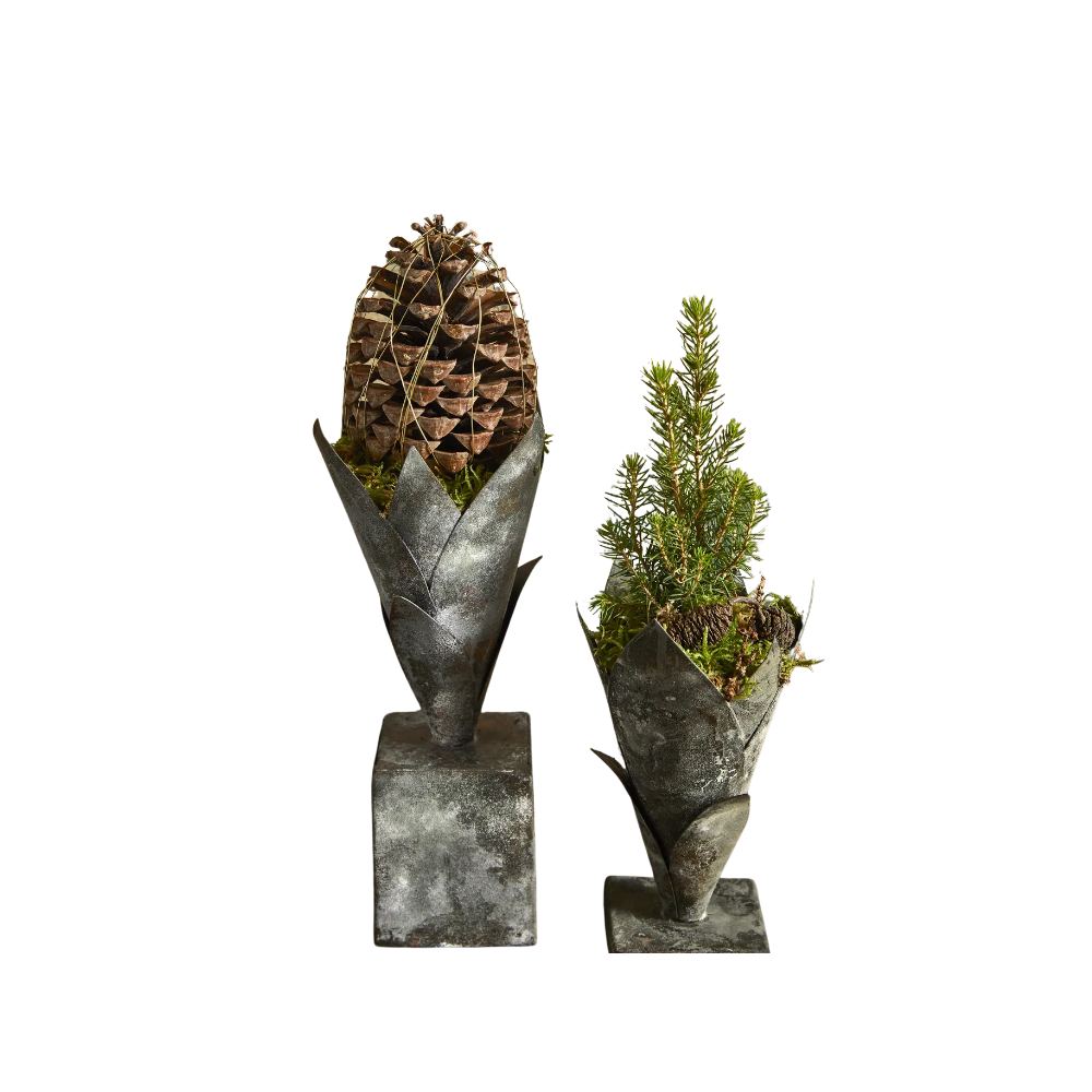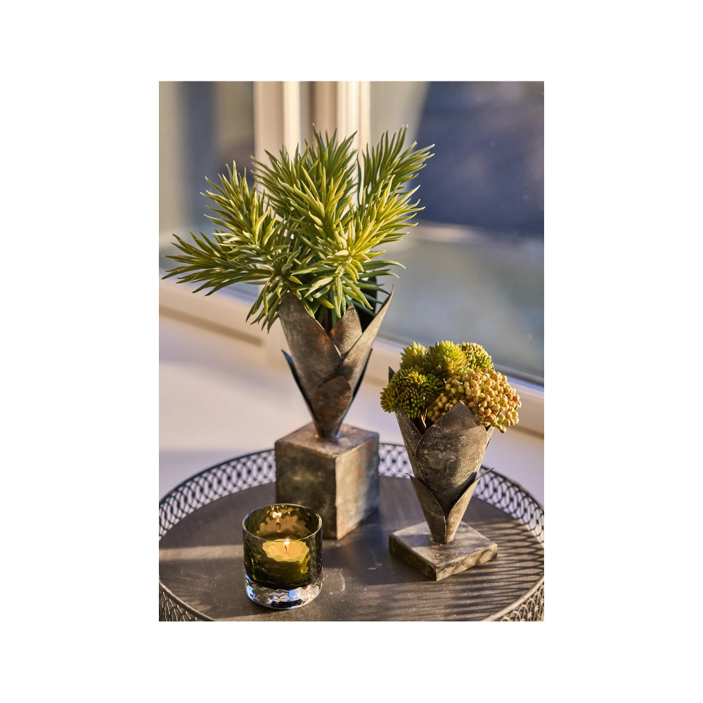 Smuk dekorativ opsats på fod i flot antik grå finish.Brug til dekoration eller som vase. Vær obs på at varen er håndlavet og svejsning kan være utæt. Placer derfor på beskyttet overflader.